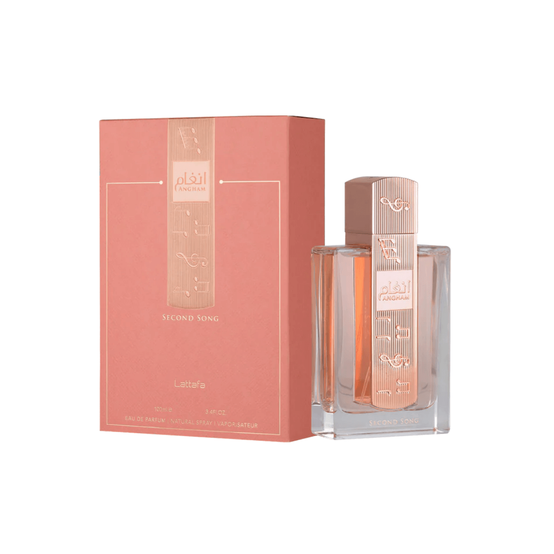 Angham Second Song von Lattafa ist ein moderner, femininer Duft, der mit Bergamotte und Birnenblüte eröffnet, in Orangenblüte, Pfingstrose und einen Hauch von Praline übergeht und schließlich mit Vanille, Tonkabohne, Ambroxan und Moschus für einen weichen, eleganten Ausklang sorgt